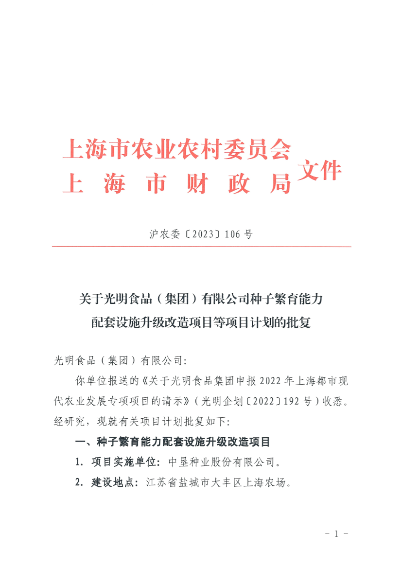 你单位报送的《关于光明食品集团申报2022年上海都市现代农业发展专项项目的请示》(光明企划〔2022〕192号)收悉。经研究,现就有关项目计划批复如下: