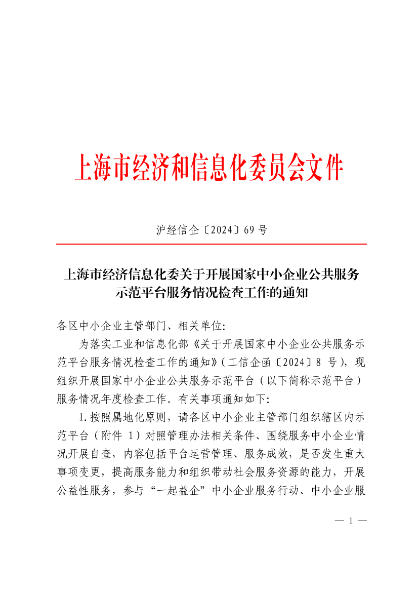 为落实工业和信息化部《关于开展国家中小企业公共服务示范平台服务情况检查工作的通知》(工信企函〔2024〕8号),现组织开展国家中小企业公共服务示范平台(以下简称示范平台)服务情况年度检查工作。有关事项通知如下: