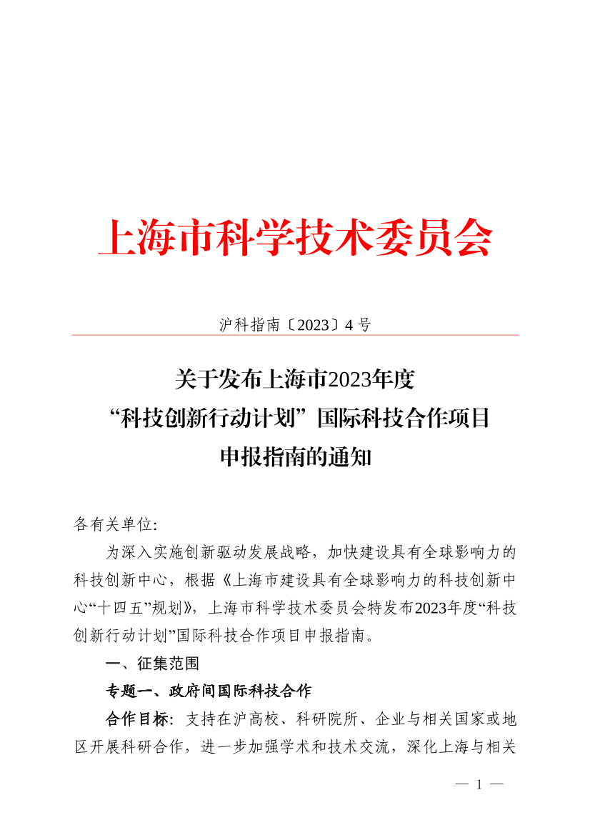 为深入实施创新驱动发展战略,加快建设具有全球影响力的科技创新中心,根据《上海市建设具有全球影响力的科技创新中心“十四五”规划》,上海市科学技术委员会特发布2023年度“科技创新行动计划”国际科技合作项目申报指南。