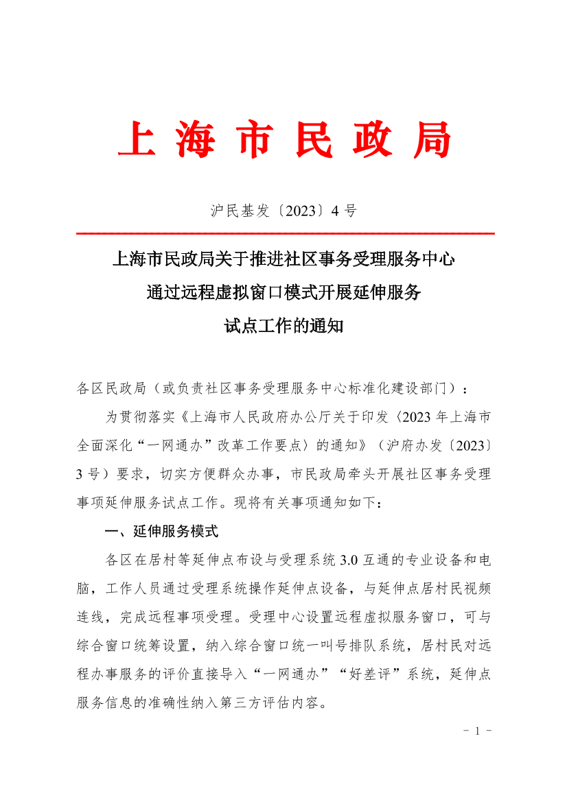为贯彻落实《上海市人民政府办公厅关于印发〈2023年上海市全面深化“一网通办”改革工作要点〉的通知》(沪府办发〔2023〕3号)要求,切实方便群众办事,市民政局牵头开展社区事务受理事项延伸服务试点工作。现将有关事项通知如下: