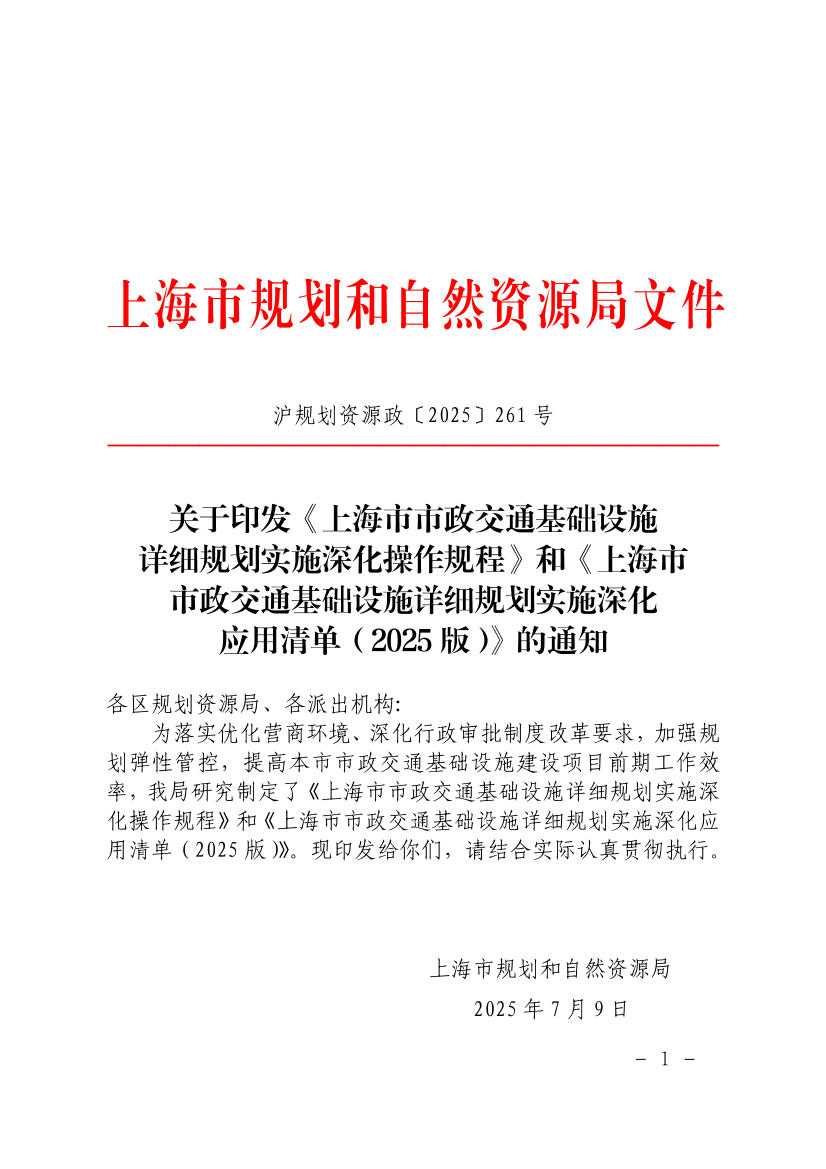 关于印发《上海市市政交通基础设施详细规划实施深化操作规程》和《上海市市政交通基础设施详细规划实施深化应用清单(2025版)》的通知