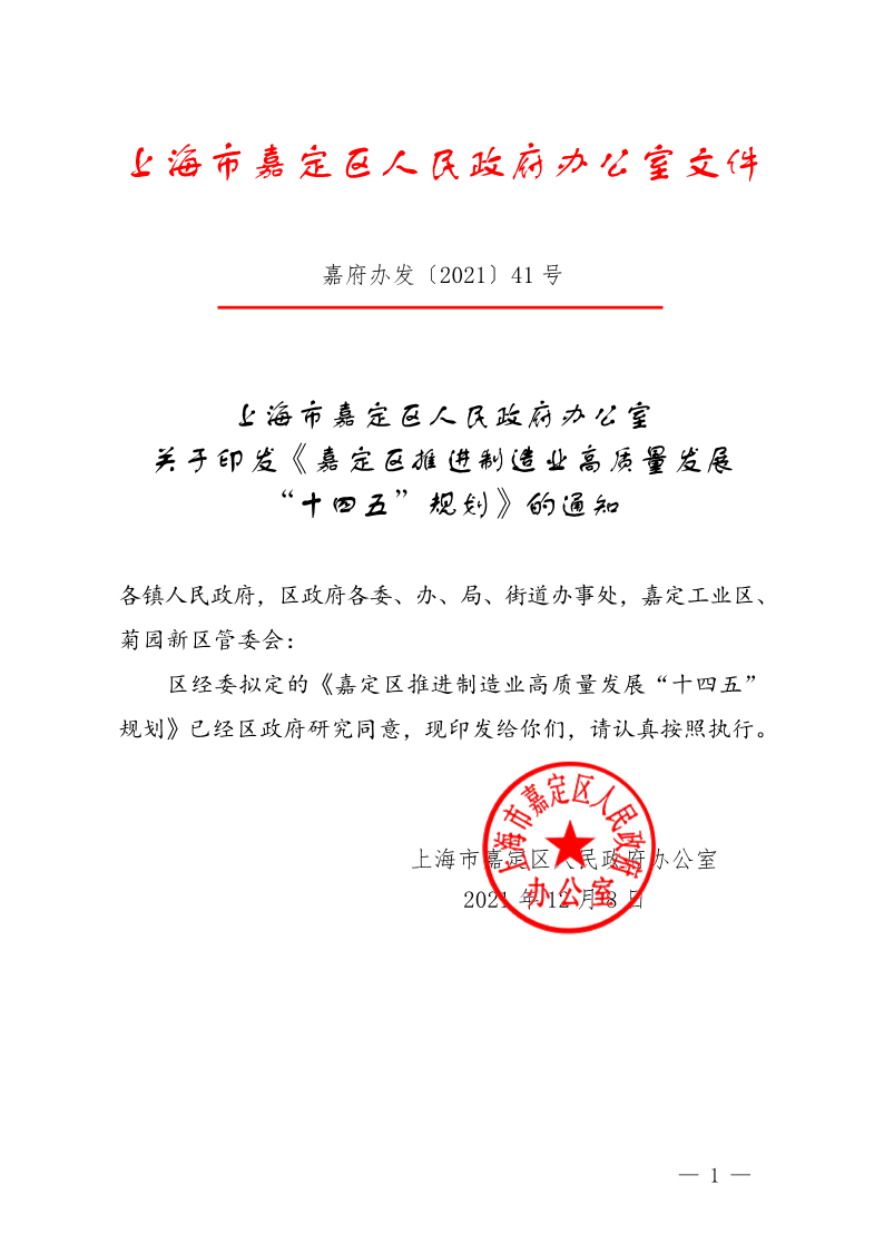 区经委拟定的《嘉定区推进制造业高质量发展“十四五”规划》已经区政府研究同意,现印发给你们,请认真按照执行。