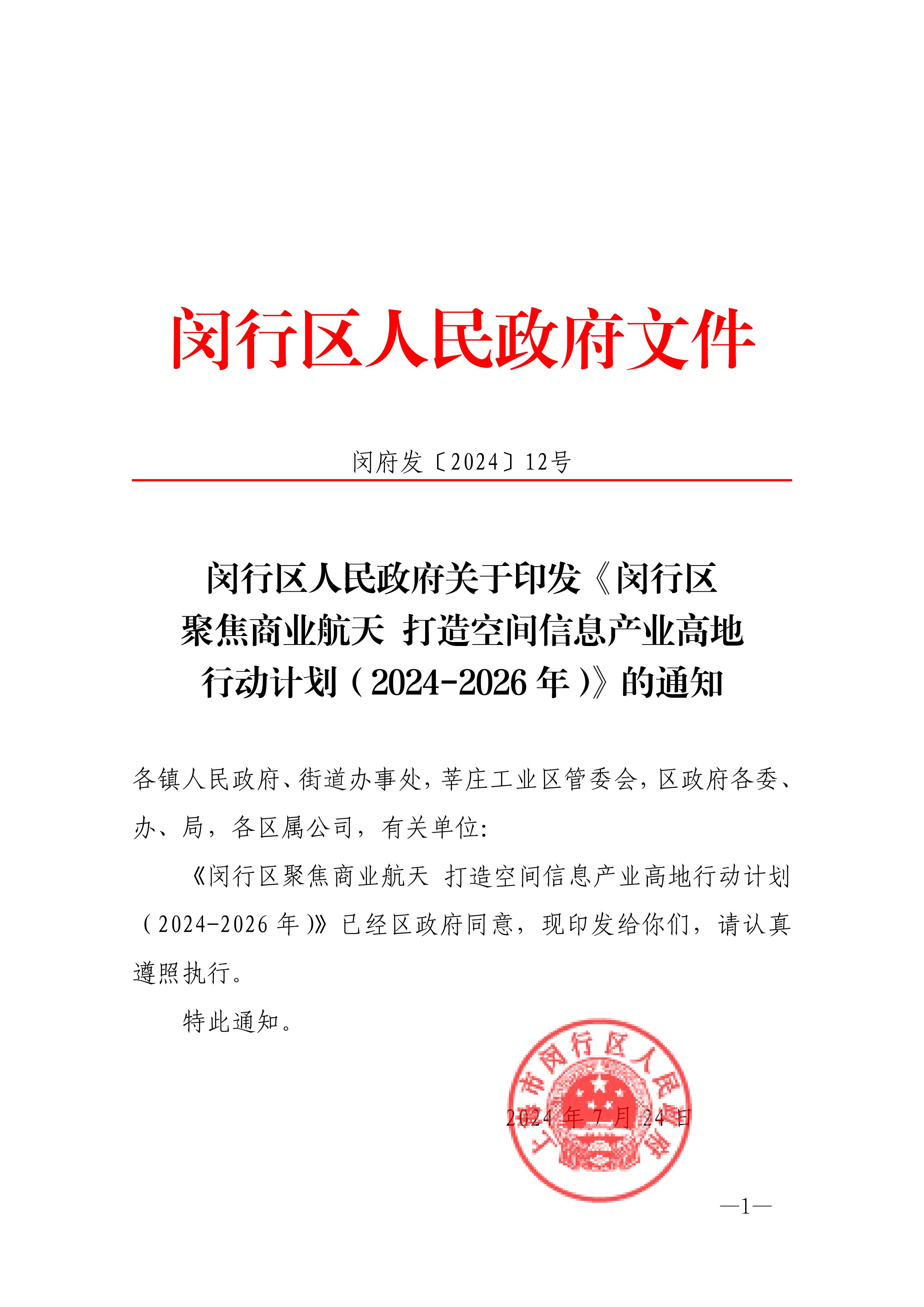 《闵行区聚焦商业航天 打造空间信息产业高地行动计划(2024-2026年)》已经区政府同意,现印发给你们,请认真遵照执行。