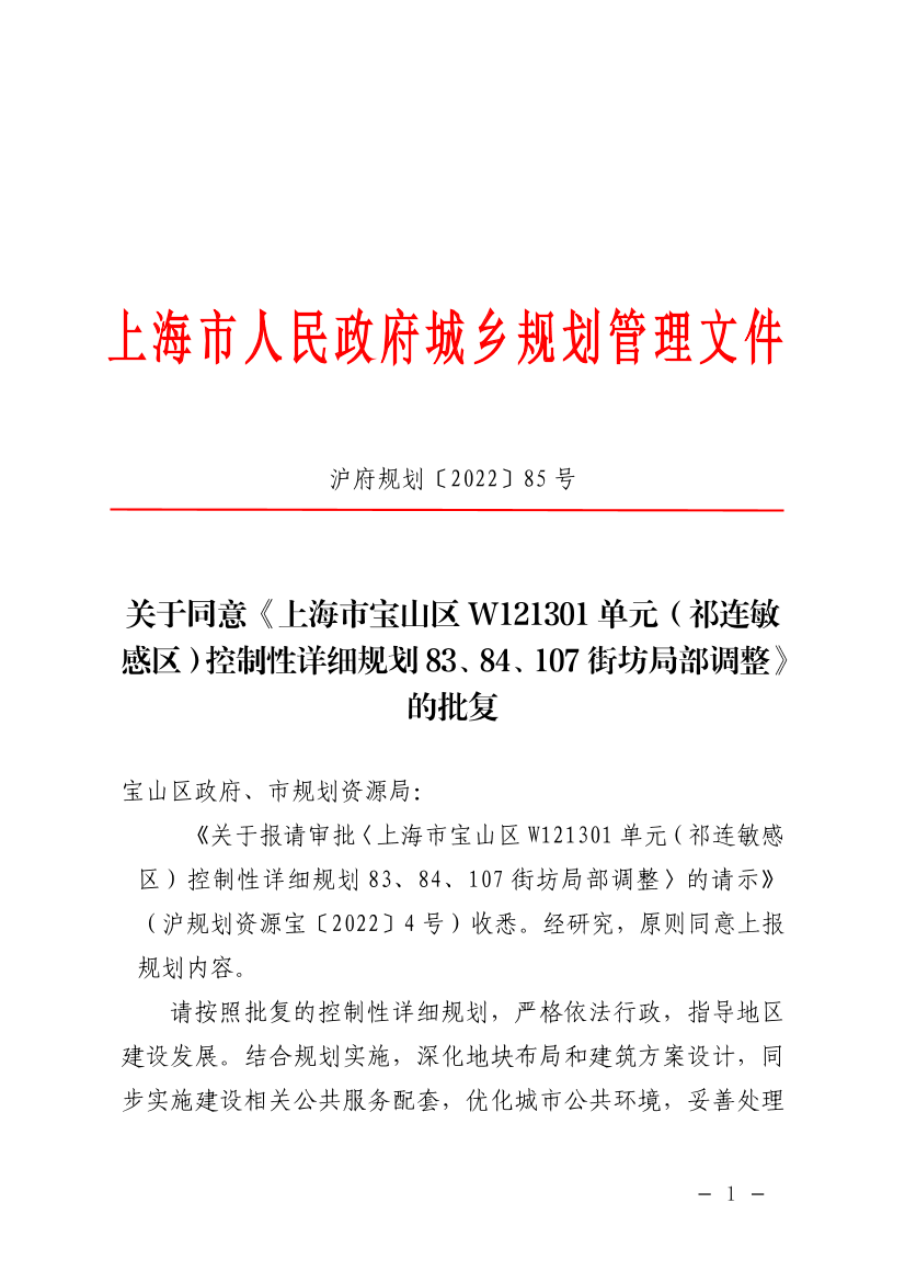《关于报请审批〈上海市宝山区W121301单元(祁连敏感区)控制性详细规划83、84、107街坊局部调整〉的请示》(沪规划资源宝〔2022〕4号)收悉。经研究,原则同意上报规划内容。