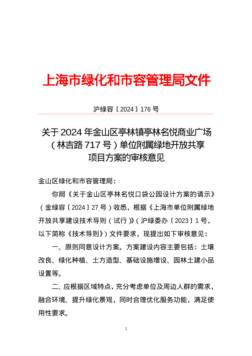 你局《关于金山区亭林名悦口袋公园设计方案的请示》(金绿容〔2024〕27号)收悉,根据《上海市单位附属绿地
