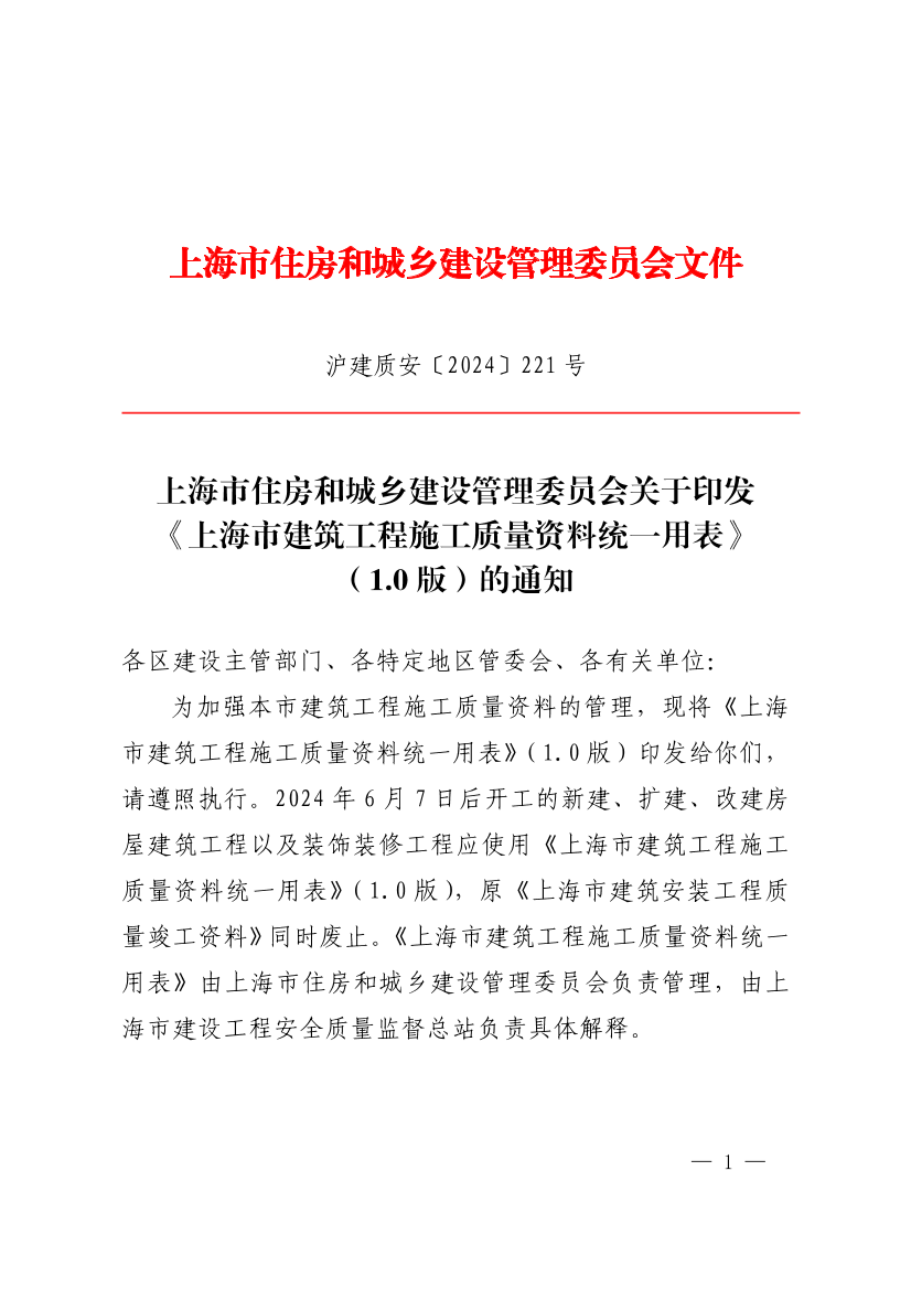 为加强本市建筑工程施工质量资料的管理,现将《上海市建筑工程施工质量资料统一用表》(1.0版)印发给你们,请遵照执行。2024年6月7日后开工的新建、扩建、改建房屋建筑工程以及装饰装修工程应使用《上海市建筑工程施工质量资料统一用表》(1.0版),原《上海市建筑安装工程质量竣工资料》同时废止。《上海市建筑工程施工质量资料统一用表》由上海市住房和城乡建设管理委员会负责管理,由上海市建设工程安全质量监督总站负责具体解释。