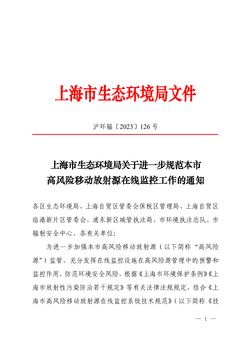 为进一步加强本市高风险移动放射源(以下简称“高风险源”)监管,充分发挥在线监控设施在高风险源管理中的预警和监控作用,防范环境安全风险,根据《上海市环境保护条例》《上海市放射性污染防治若干规定》等有关法律法规规定,结合《上海市高风险移动放射源在线监控系统技术规范》(以下简称《技术规范》,详见附件)有关要求,现就相关管理要求通知如下:
