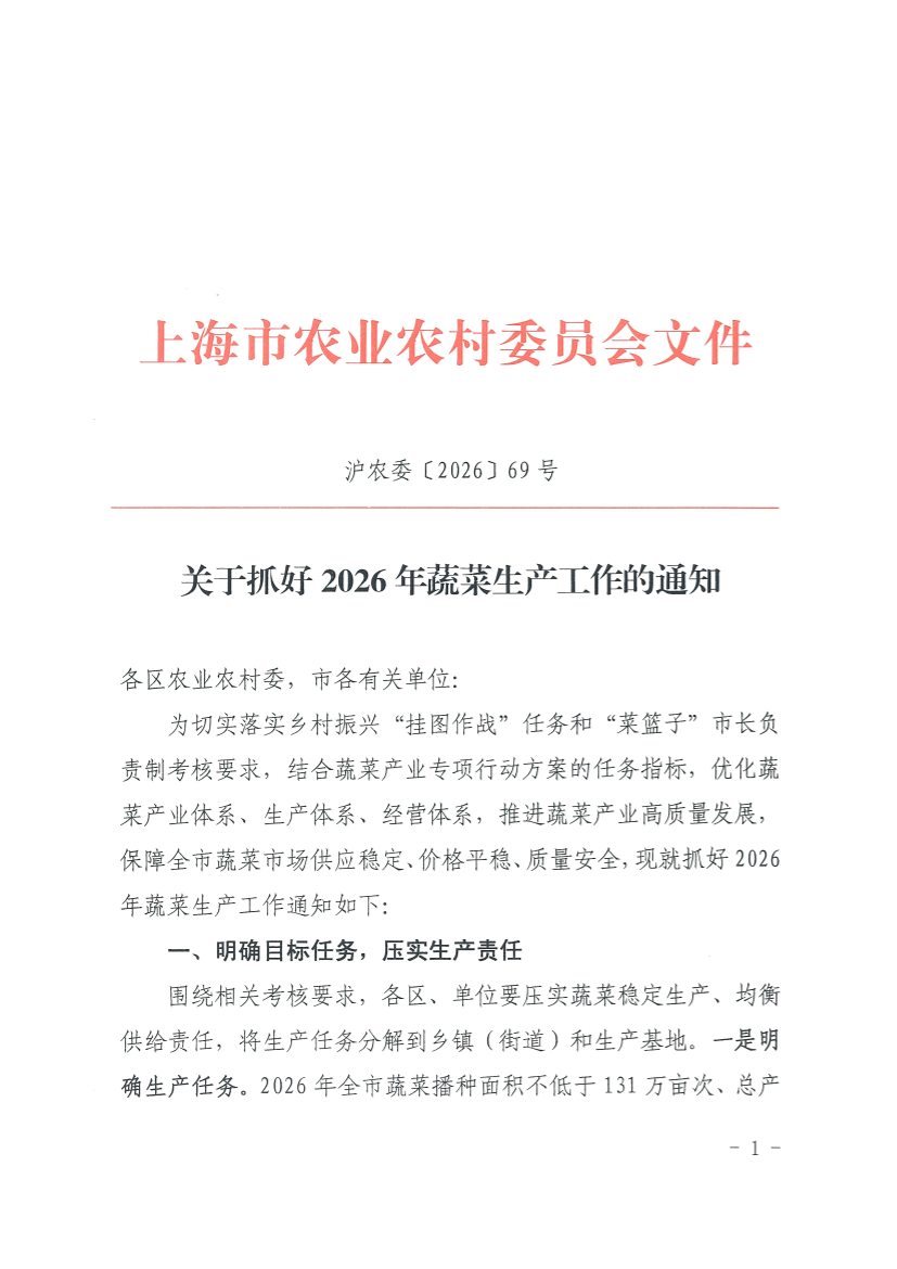 为切实落实乡村振兴“挂图作战”任务和“菜篮子”市长负责制考核要求,结合蔬菜产业专项行动方案的任务指标,优化蔬菜产业体系、生产体系、经营体系,推进蔬菜产业高质量发展,保障全市蔬菜市场供应稳定、价格平稳、质量安全,现就抓好2026年蔬菜生产工作通知如下:
