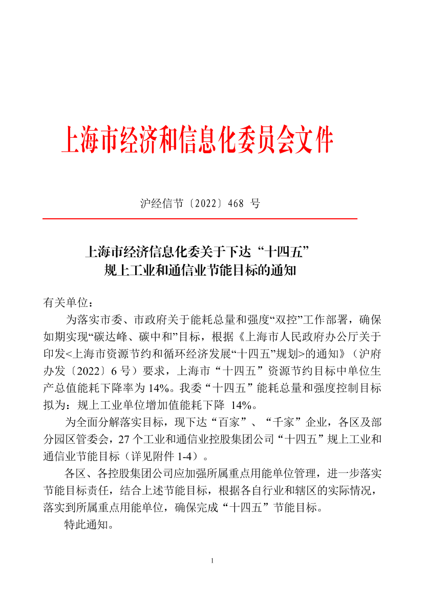 为全面分解落实目标,现下达“百家”、“千家”企业,各区及部分园区管委会,27个工业和通信业控股集团公司“十四五”规上工业和通信业节能目标(详见附件1-4)。