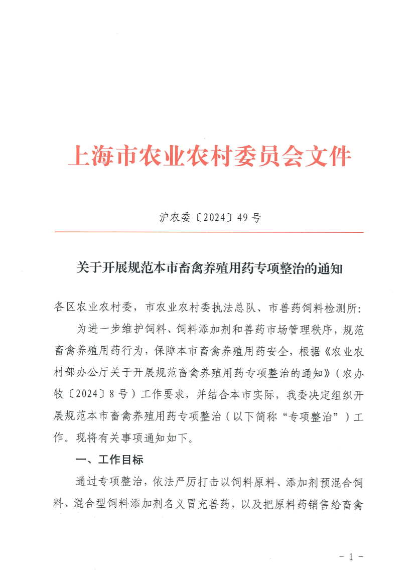 为进一步维护饲料、饲料添加剂和兽药市场管理秩序,规范畜禽养殖用药行为,保障本市畜禽养殖用药安全,根据《农业农村部办公厅关于开展规范畜禽养殖用药专项整治的通知》(农办牧〔2024〕8号)工作要求,并结合本市实际,我委决定组织开展规范本市畜禽养殖用药专项整治(以下简称“专项整治”)工作。现将有关事项通知如下。