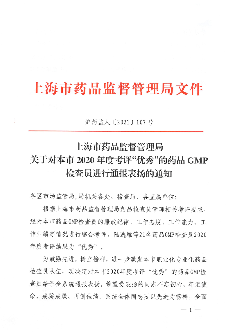 为鼓励先进,树立榜样,进一步激发本市职业化专业化药品检查员队伍,现决定对本市2020年度考评“优秀”的药品GMP检查员给予全系统通报表扬。希望受表扬的同志不忘初心、牢记使命,戒骄戒躁、再创佳绩。系统全体同志要以先进为榜样,全面学习贯彻党的十九届五中全会精神和习近平总书记在浦东开发开放30周年庆祝大会上重要讲话精神,落实国务院办公厅《关于进一步加强药品监管能力建设的实施意见》有关要求,立足本职岗位,坚定信心、振奋精神、奋发作为,以优异成绩庆祝建党100周年。