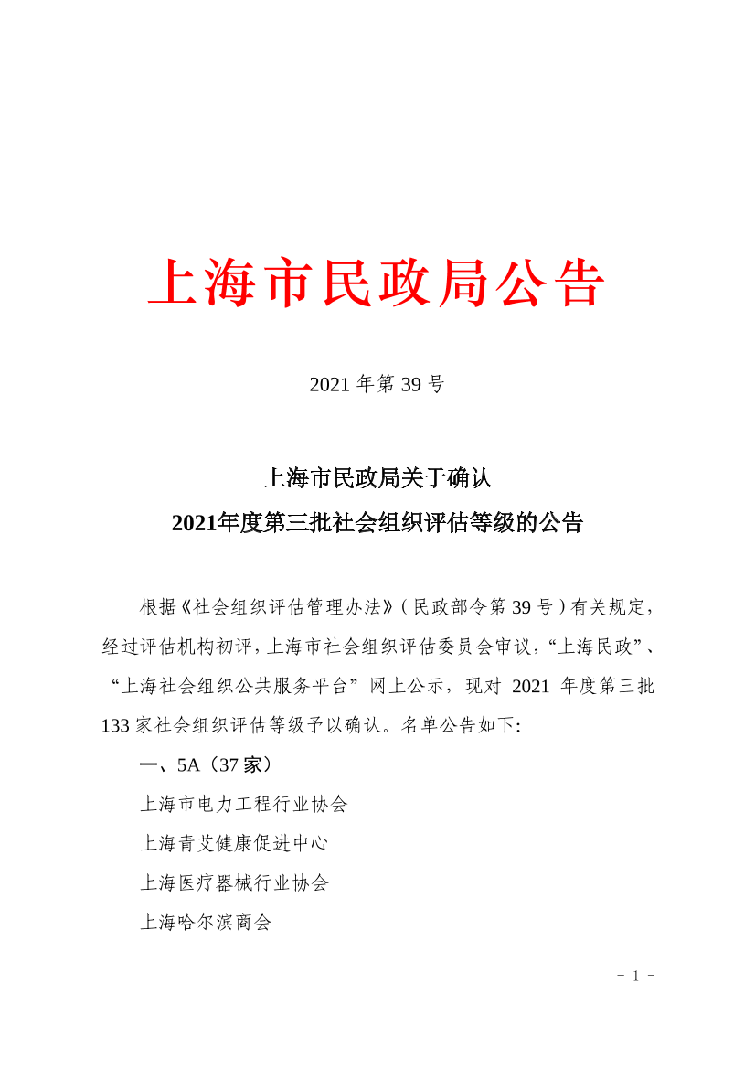 根据《社会组织评估管理办法》(民政部令第39号)有关规定,经过评估机构初评,上海市社会组织评估委员会审议,“上海民政”、“上海社会组织公共服务平台”网上公示,现对2021年度第三批133家社会组织评估等级予以确认。名单公告如下: