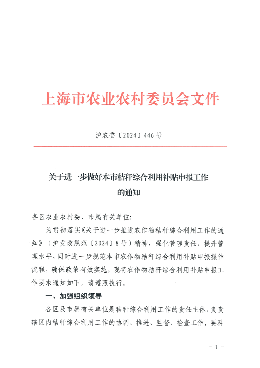 为贯彻落实《关于进一步推进农作物秸秆综合利用工作的通知》(沪发改规范〔2024〕8号)精神,强化管理责任,提升管理水平,同时进一步规范本市农作物秸秆综合利用补贴申报操作流程,确保政策有效实施,现将农作物秸秆综合利用补贴申报工作要求通知如下,请遵照执行。