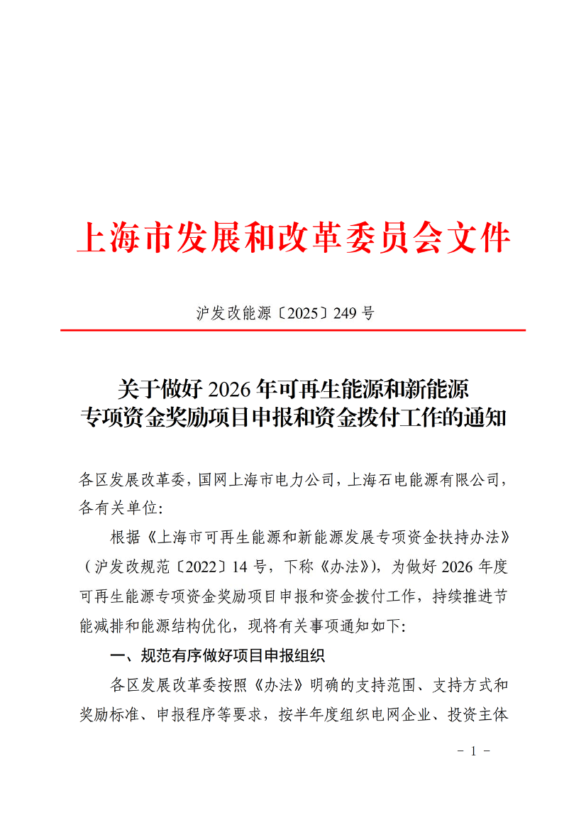 根据《上海市可再生能源和新能源发展专项资金扶持办法》(沪发改规范〔2022〕14号,下称《办法》),为做好2026年度可再生能源专项资金奖励项目申报和资金拨付工作,持续推进节能减排和能源结构优化,现将有关事项通知如下: