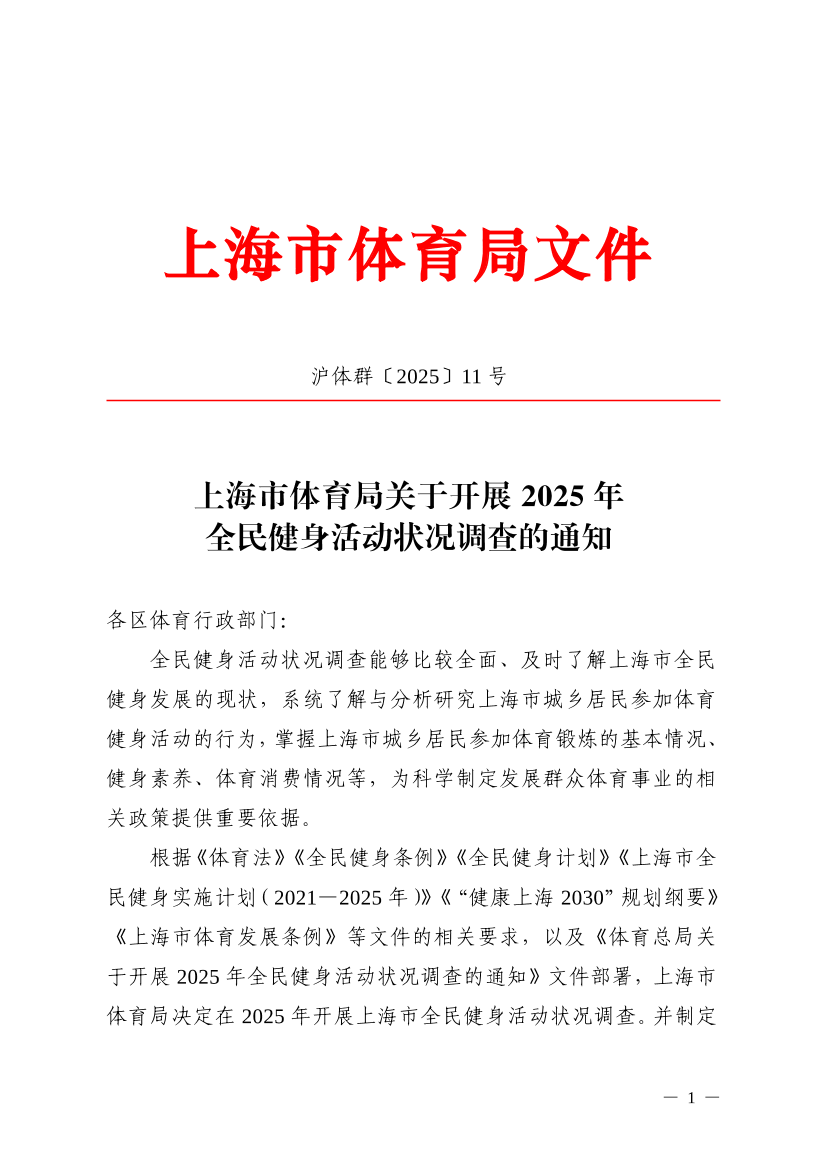 根据《体育法》《全民健身条例》《全民健身计划》《上海市全民健身实施计划(2021—2025年)》《“健康上海2030”规划纲要》《上海市体育发展条例》等文件的相关要求,以及《体育总局关于开展2025年全民健身活动状况调查的通知》文件部署,上海市体育局决定在2025年开展上海市全民健身活动状况调查。并制定了《2025年上海市全民健身活动状况调查工作方案》(见附件),现印发给你们。