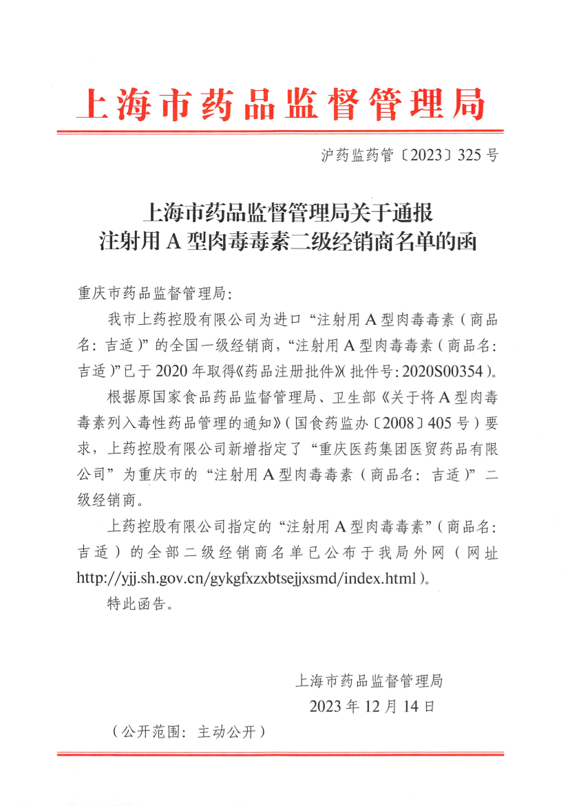 根据原国家食品药品监督管理局、卫生部《关于将A型肉毒毒素列入毒性药品管理的通知》(国食药监办〔2008〕405号)要求,上药控股有限公司新增指定了“重庆医药集团医贸药品有限公司”为重庆市的“注射用A型肉毒毒素(商品名:吉适)”二级经销商。