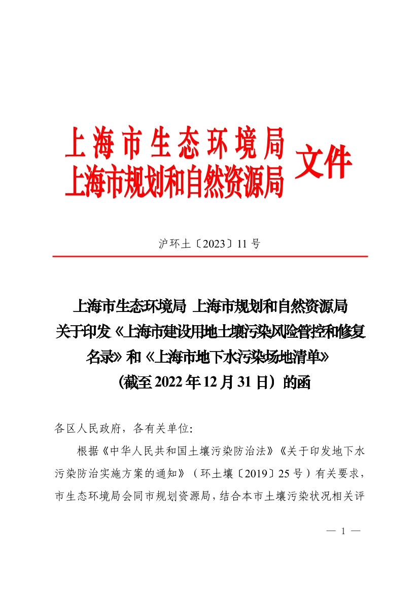 根据《中华人民共和国土壤污染防治法》《关于印发地下水污染防治实施方案的通知》(环土壤〔2019〕25号)有关要求,市生态环境局会同市规划资源局,结合本市土壤污染状况相关评审情况(截至2022年12月31日),将《上海市建设用地土壤污染风险管控和修复名录(截至2022年12月1日)》中的“杨浦区336街坊015-01地块”等2个地块移出名录(附件1);无新增需实施风险管控、修复的地块。上海市地下水污染场地清单无新增和移出。现将《上海市建设用地土壤污染风险管控和修复名录》(截至2022年12月31日)(附件2,以下简称《名录》)及《上海市地下水污染场地清单》(截至2022年12月31日)(附件3,以下简称《清单》)印发给你们。