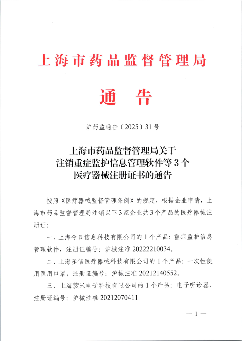 一、上海今日信息科技有限公司的1个产品:重症监护信息管理软件,注册证编号:沪械注准20222210034。