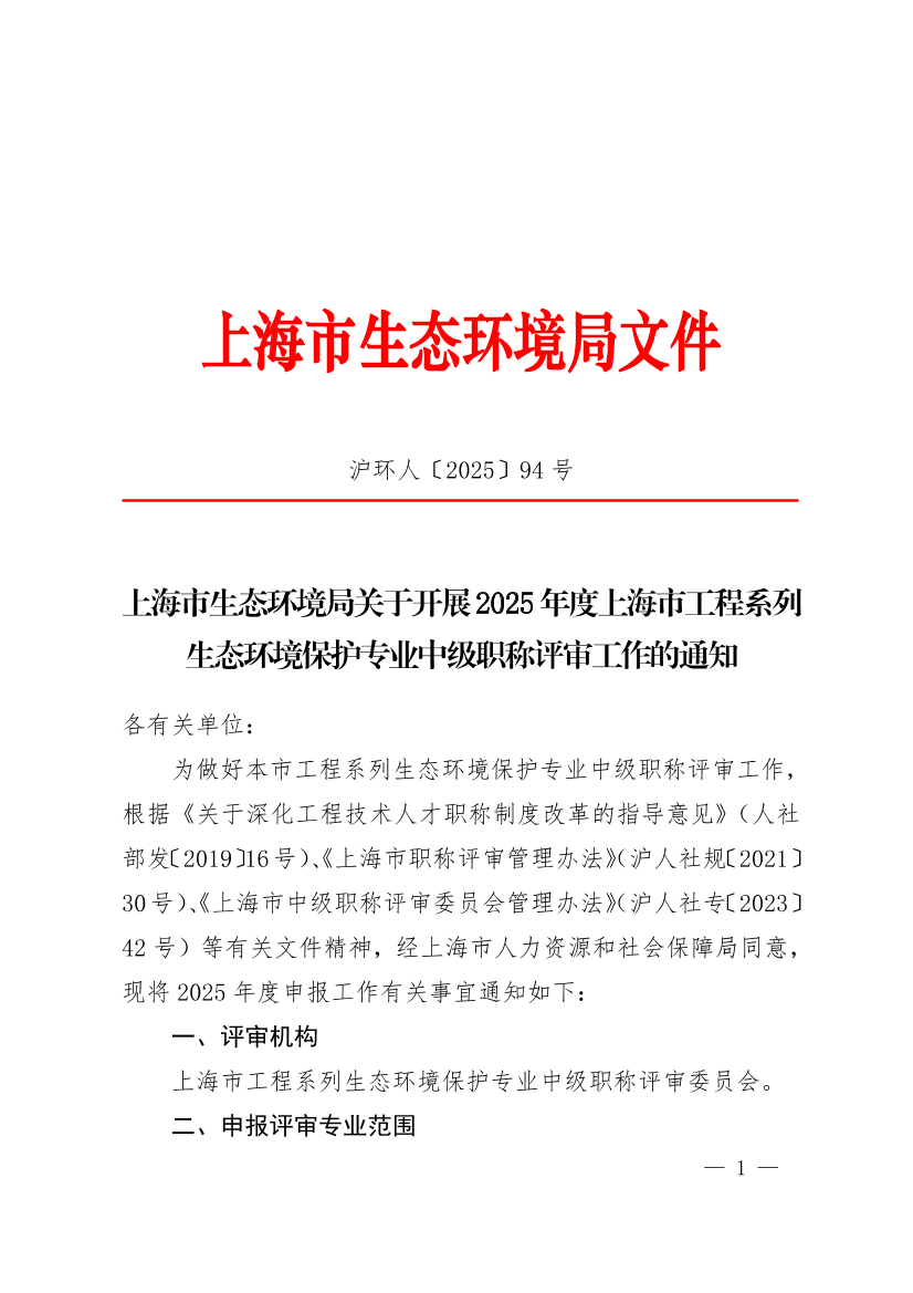 为做好本市工程系列生态环境保护专业中级职称评审工作,根据《关于深化工程技术人才职称制度改革的指导意见》(人社部发〔2019〕16号)、《上海市职称评审管理办法》(沪人社规〔2021〕30号)、《上海市中级职称评审委员会管理办法》(沪人社专〔2023〕42号)等有关文件精神,经上海市人力资源和社会保障局同意,现将2025年度申报工作有关事宜通知如下: