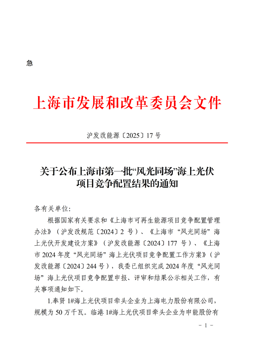 根据国家有关要求和《上海市可再生能源项目竞争配置管理办法》(沪发改规范〔2024〕2号)、《上海市“风光同场”海上光伏开发建设方案》(沪发改能源〔2024〕177号)、《上海市2024年度“风光同场”海上光伏项目竞争配置工作方案》(沪发改能源〔2024〕244号),我委已组织完成2024年度“风光同场”海上光伏项目竞争配置申报、评审和结果公示相关工作,有关事项通知如下。