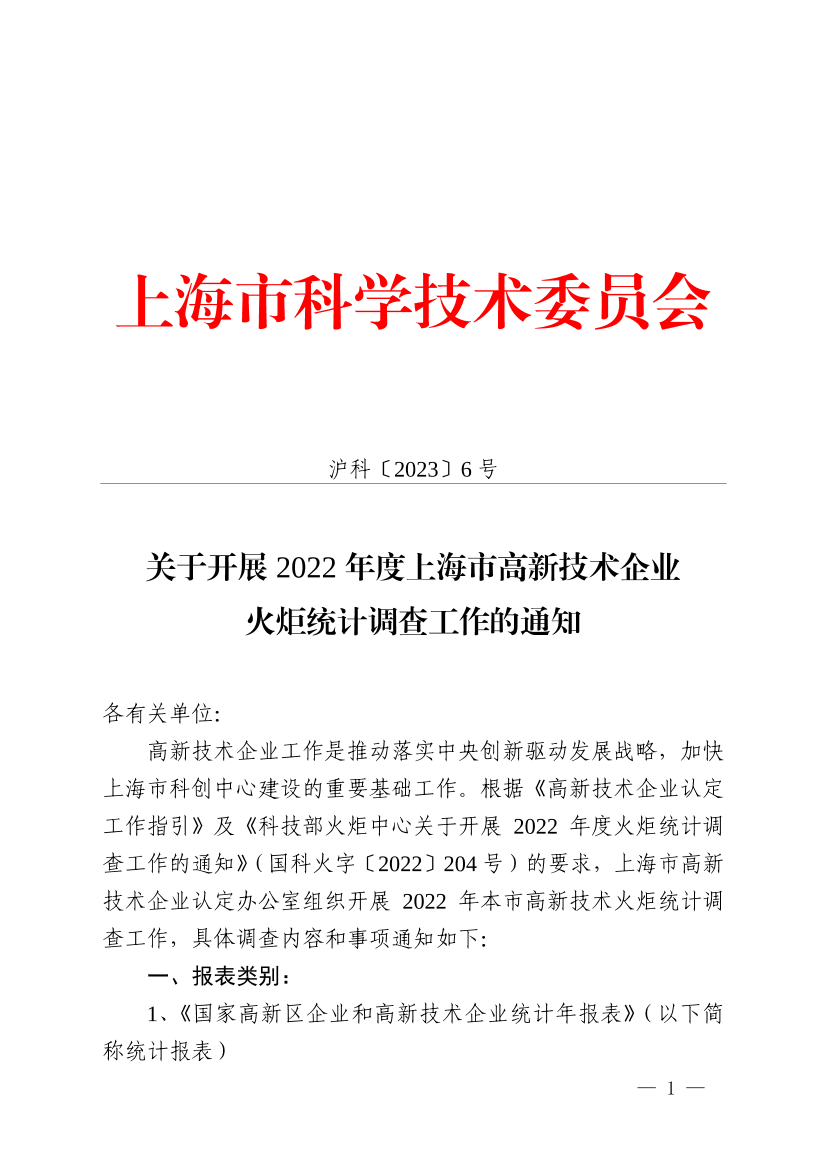 高新技术企业工作是推动落实中央创新驱动发展战略,加快上海市科创中心建设的重要基础工作。根据《高新技术企业认定工作指引》及《科技部火炬中心关于开展2022年度火炬统计调查工作的通知》(国科火字〔2022〕204号)的要求,上海市高新技术企业认定办公室组织开展2022年本市高新技术火炬统计调查工作,具体调查内容和事项通知如下:
