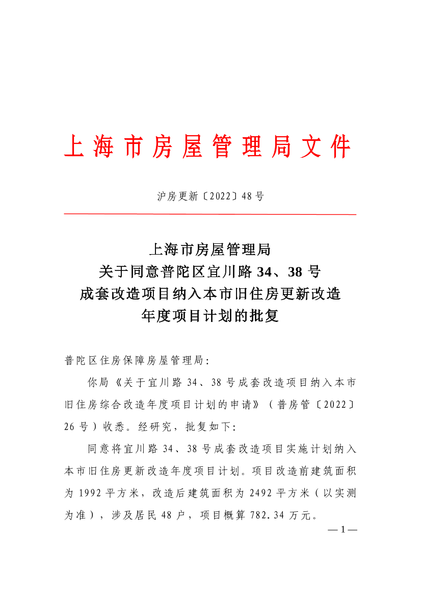 你局《关于宜川路34、38号成套改造项目纳入本市旧住房综合改造年度项目计划的申请》(普房管〔2022〕26号)收悉。经研究,批复如下:
