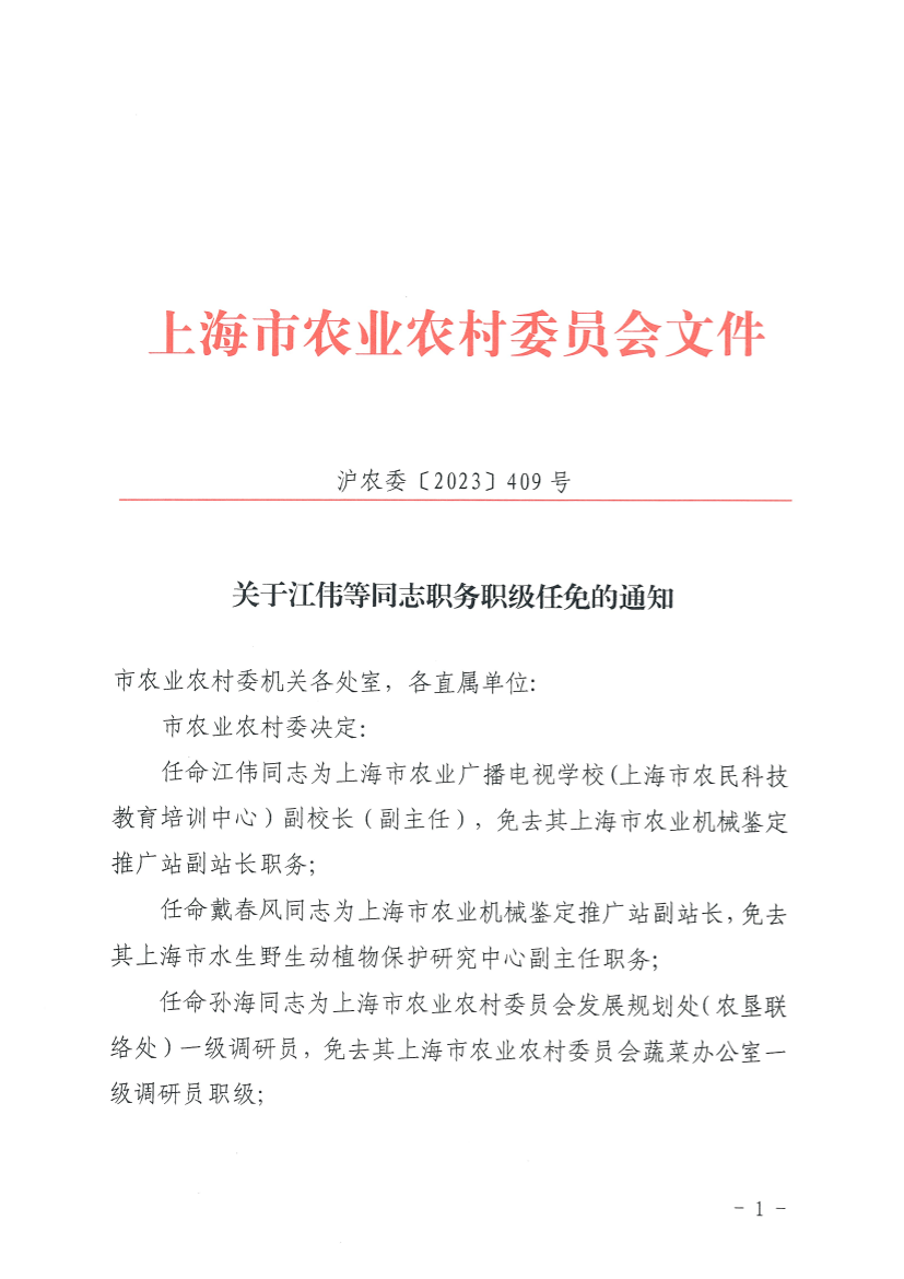 任命江伟同志为上海市农业广播电视学校(上海市农民科技教育培训中心)副校长(副主任),免去其上海市农业机械鉴定推广站副站长职务;