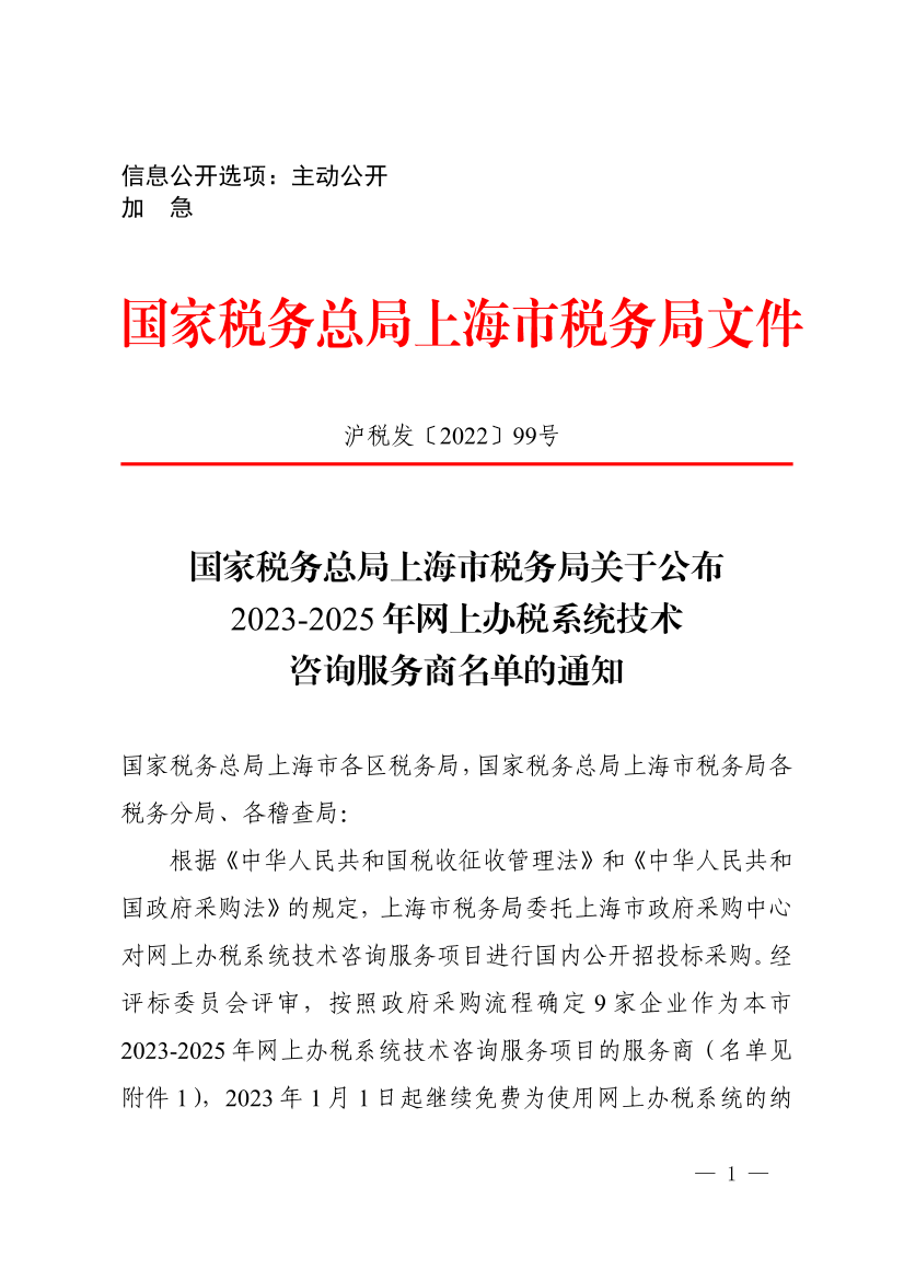 根据《中华人民共和国税收征收管理法》和《中华人民共和国政府采购法》的规定,上海市税务局委托上海市政府采购中心对网上办税系统技术咨询服务项目进行国内公开招投标采购。经评标委员会评审,按照政府采购流程确定9家企业作为本市2023-2025年网上办税系统技术咨询服务项目的服务商(名单见附件1),2023年1月1日起继续免费为使用网上办税系统的纳税人提供技术咨询服务,现将有关事项通知如下: