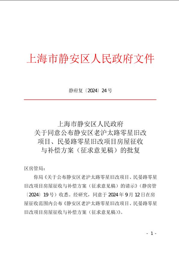 你局《关于公布静安区老沪太路零星旧改项目、民晏路零星旧改项目房屋征收与补偿方案(征求意见稿)的请示》(静房管〔2024〕19号)收悉。经研究,同意于2024年9月12日在房屋征收范围内公布《静安区老沪太路零星旧改项目、民晏路零星旧改项目房屋征收与补偿方案(征求意见稿)》。