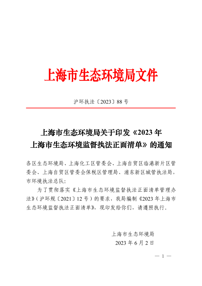为了贯彻落实《上海市生态环境监督执法正面清单管理办法》(沪环规〔2021〕12号)的要求,我局编制《2023年上海市生态环境监督执法正面清单》,现印发给你们,请遵照执行。