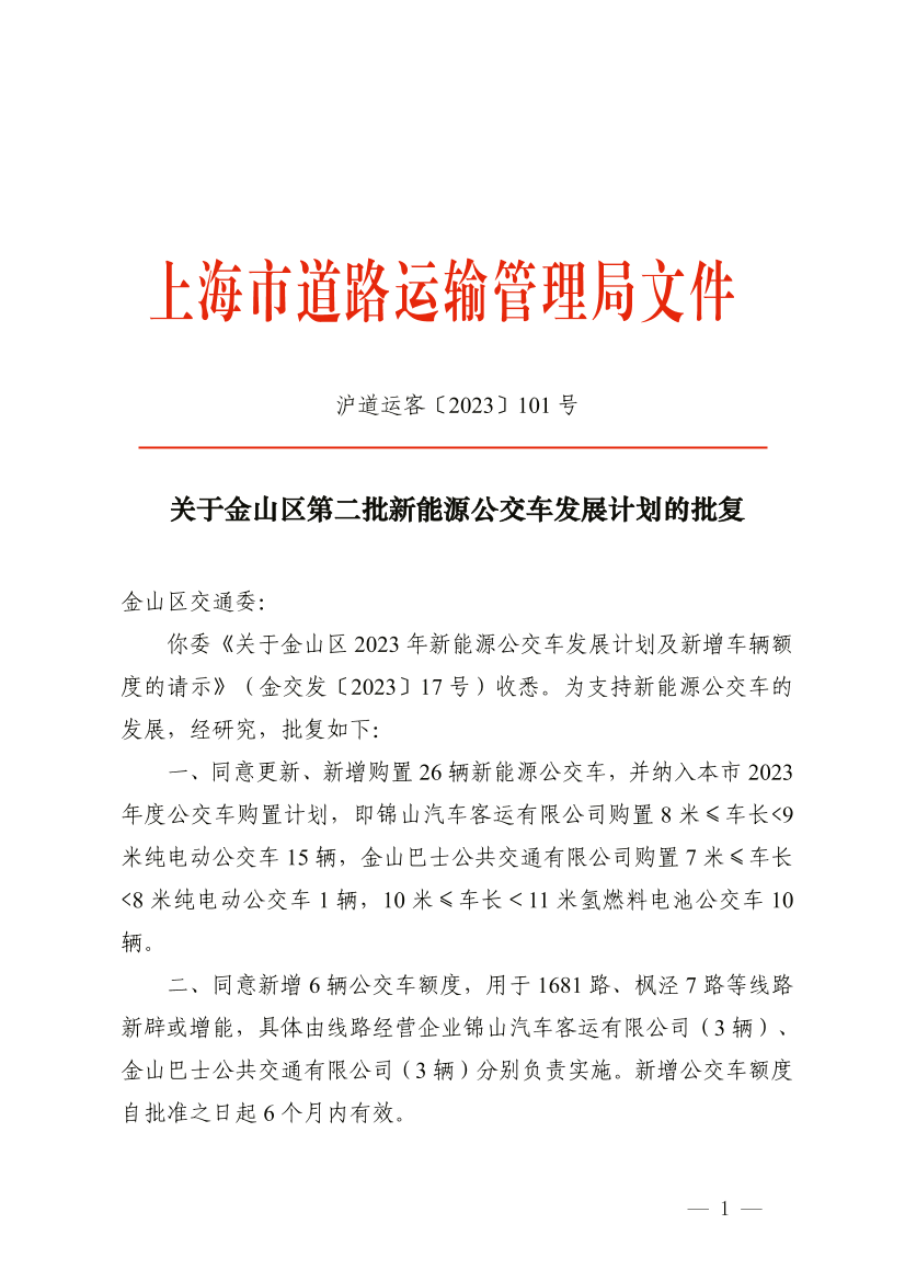 你委《关于金山区2023年新能源公交车发展计划及新增车辆额度的请示》(金交发〔2023〕17号)收悉。为支持新能源公交车的发展,经研究,批复如下: