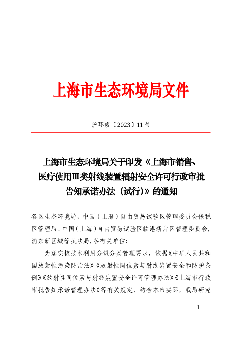 为落实核技术利用分级分类管理要求,依据《中华人民共和国放射性污染防治法》《放射性同位素与射线装置安全和防护条例》《放射性同位素与射线装置安全许可管理办法》《上海市行政审批告知承诺管理办法》等有关规定,结合本市实际,我局研究制定了《上海市销售、医疗使用Ⅲ类射线装置辐射安全许可行政审批告知承诺办法(试行)》,现印发给你们,请遵照执行。
