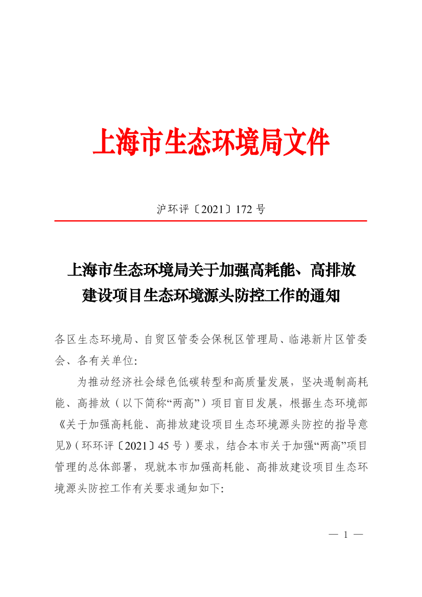 为推动经济社会绿色低碳转型和高质量发展,坚决遏制高耗能、高排放(以下简称“两高”)项目盲目发展,根据生态环境部《关于加强高耗能、高排放建设项目生态环境源头防控的指导意见》(环环评〔2021〕45号)要求,结合本市关于加强“两高”项目管理的总体部署,现就本市加强高耗能、高排放建设项目生态环境源头防控工作有关要求通知如下: