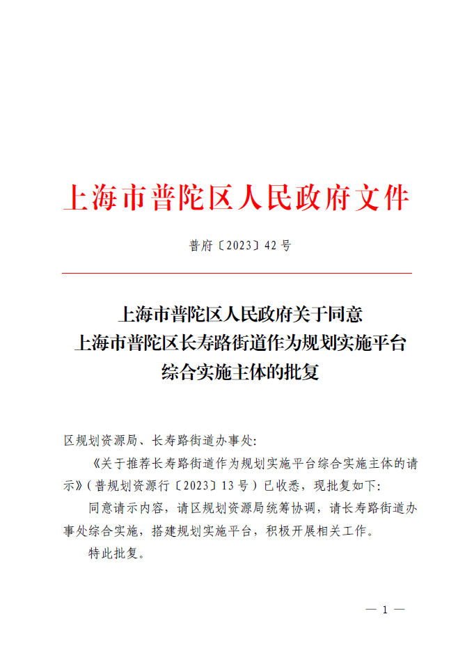 《关于推荐长寿路街道作为规划实施平台综合实施主体的请示》(普规划资源行〔2023〕13号)已收悉,现批复如下: