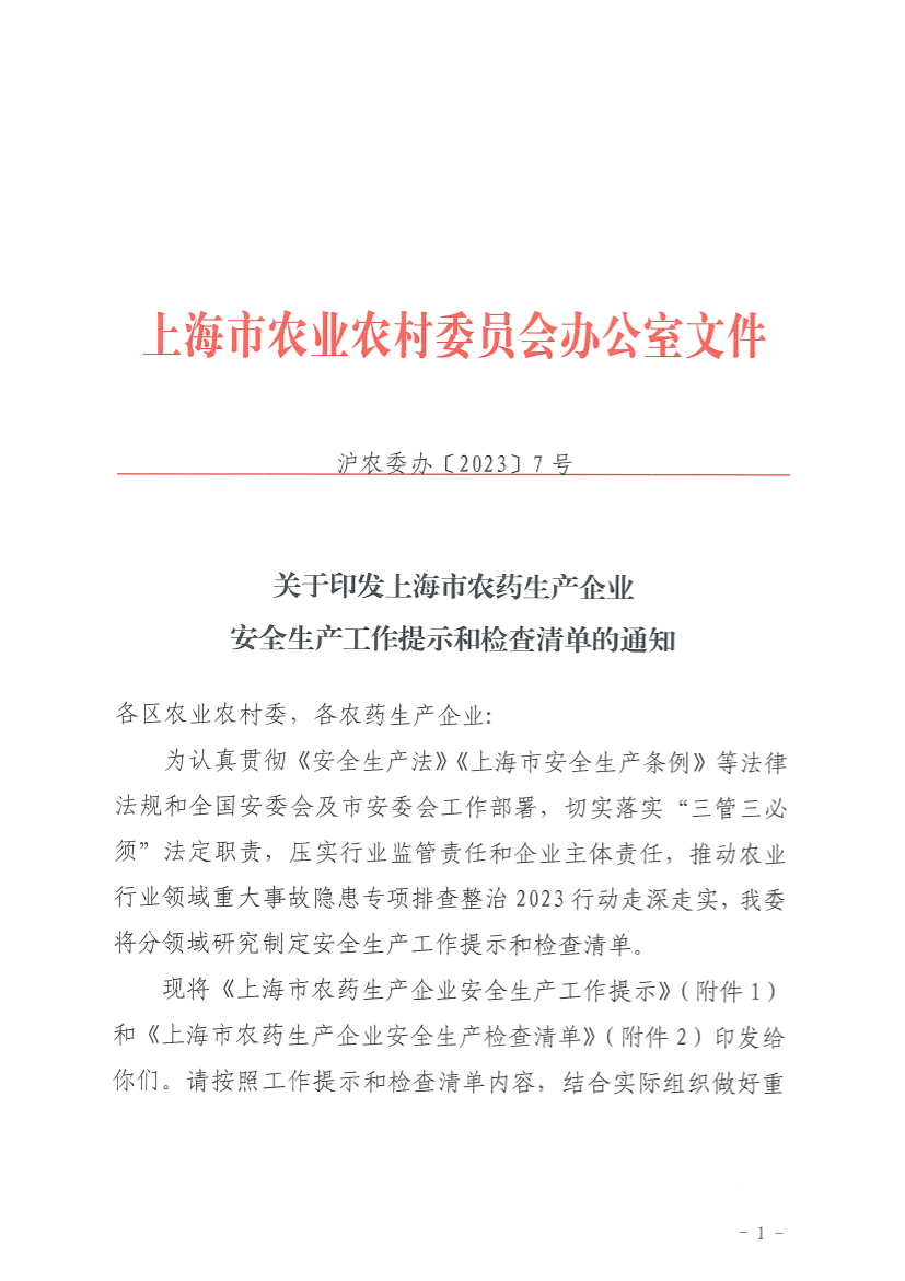 现将《上海市农药生产企业安全生产工作提示》(附件1)和《上海市农药生产企业安全生产检查清单》(附件2)印发给你们。请按照工作提示和检查清单内容,结合实际组织做好重大事故隐患排查整治工作,确保安全生产各项制度措施落实落地,以良好的安全生产环境保障本市农药生产行业高质量发展。