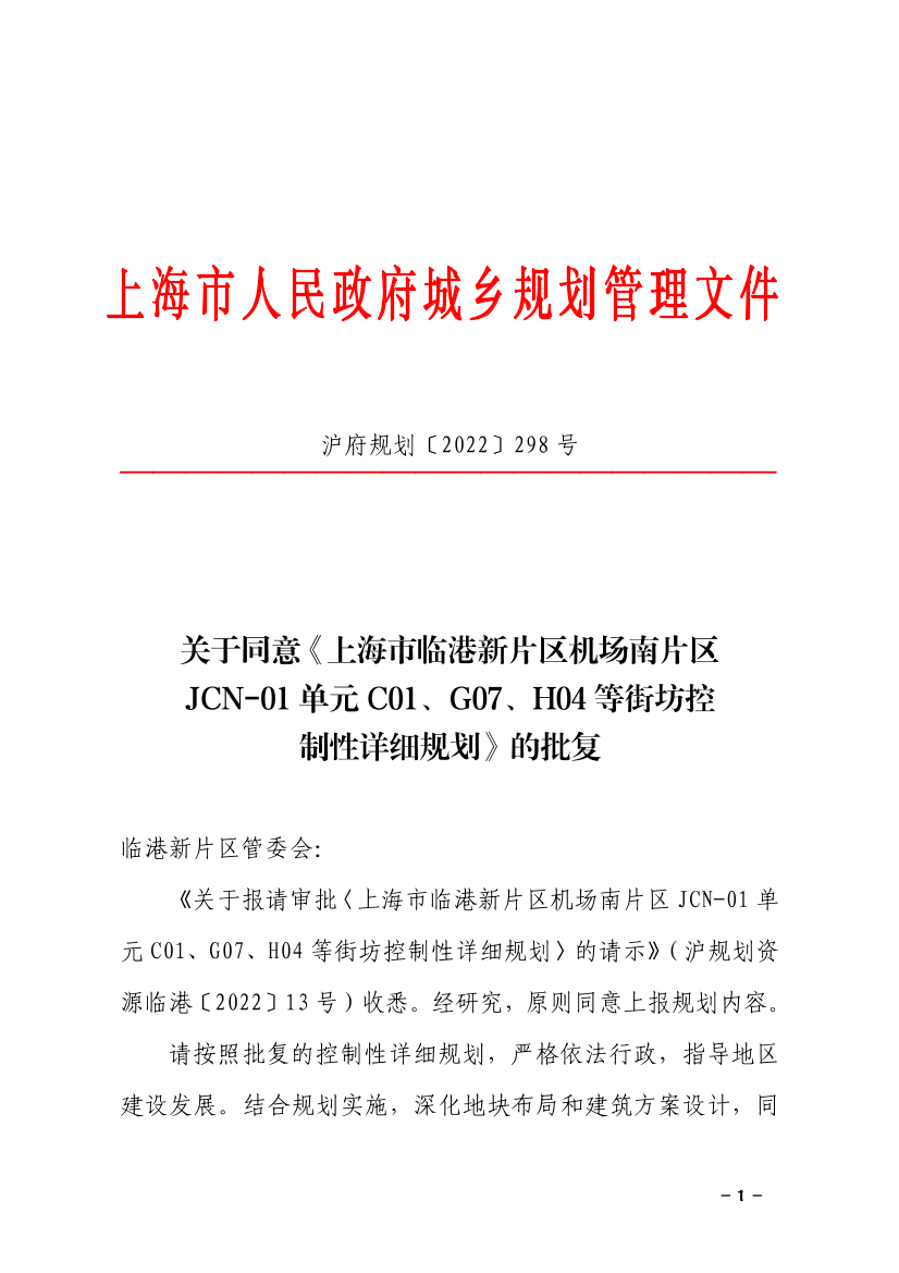 《关于报请审批〈上海市临港新片区机场南片区JCN-01单元C01、G07、H04等街坊控制性详细规划〉的请示》(沪规划资源临港〔2022〕13号)收悉。经研究,原则同意上报规划内容。