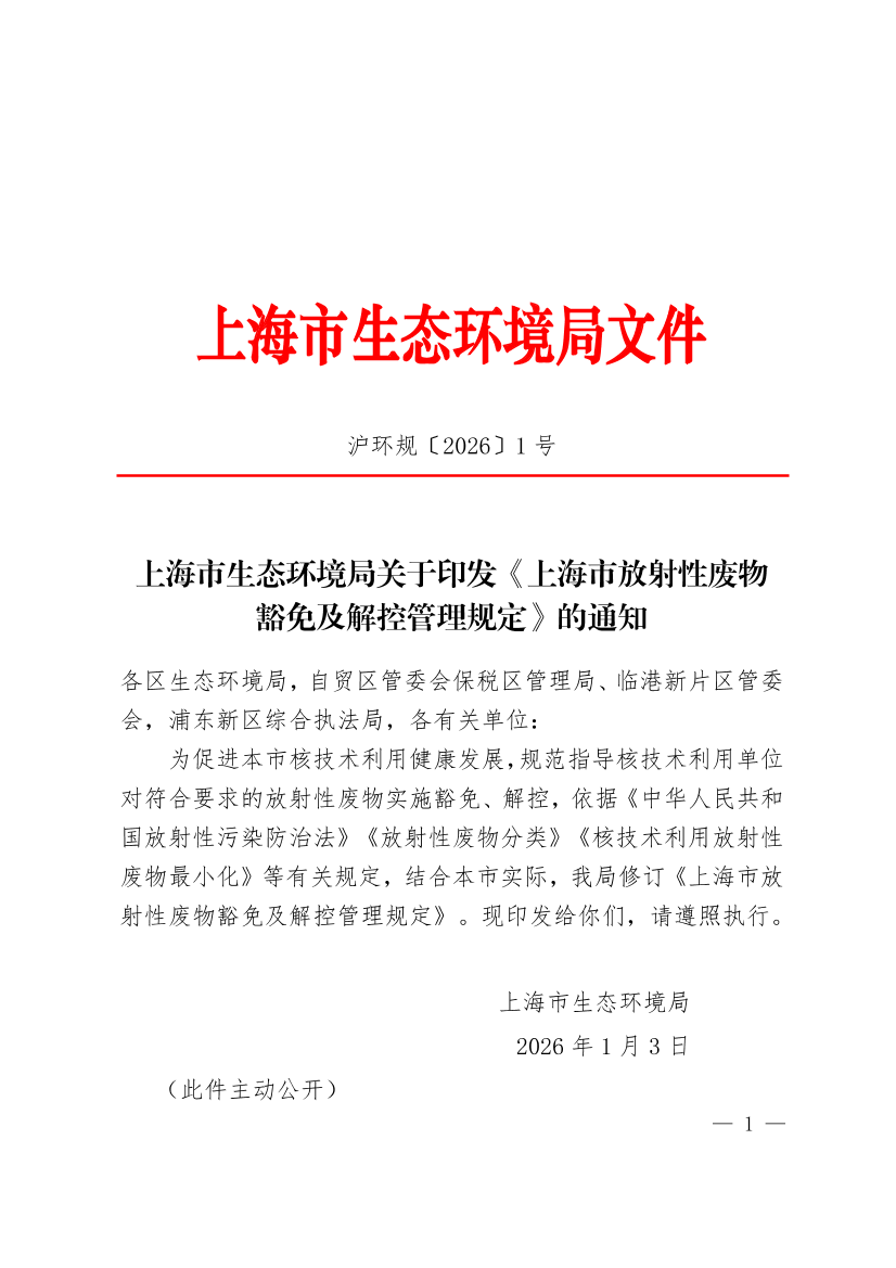 为促进本市核技术利用健康发展,规范指导核技术利用单位对符合要求的放射性废物实施豁免、解控,依据《中华人民共和国放射性污染防治法》《放射性废物分类》《核技术利用放射性废物最小化》等有关规定,结合本市实际,我局修订《上海市放射性废物豁免及解控管理规定》。现印发给你们,请遵照执行。