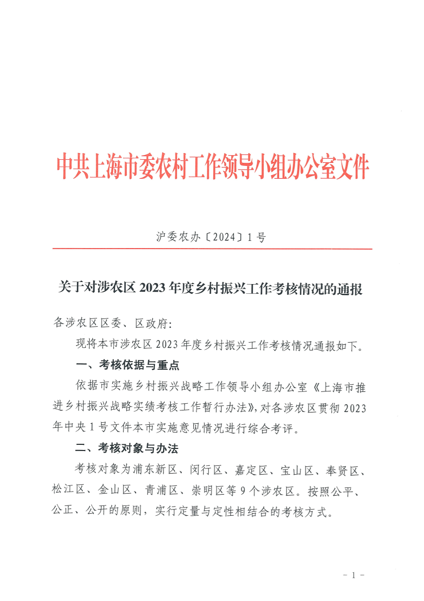 依据市实施乡村振兴战略工作领导小组办公室《上海市推进乡村振兴战略实绩考核工作暂行办法》,对各涉农区贯彻2023年中央1号文件本市实施意见情况进行综合考评。