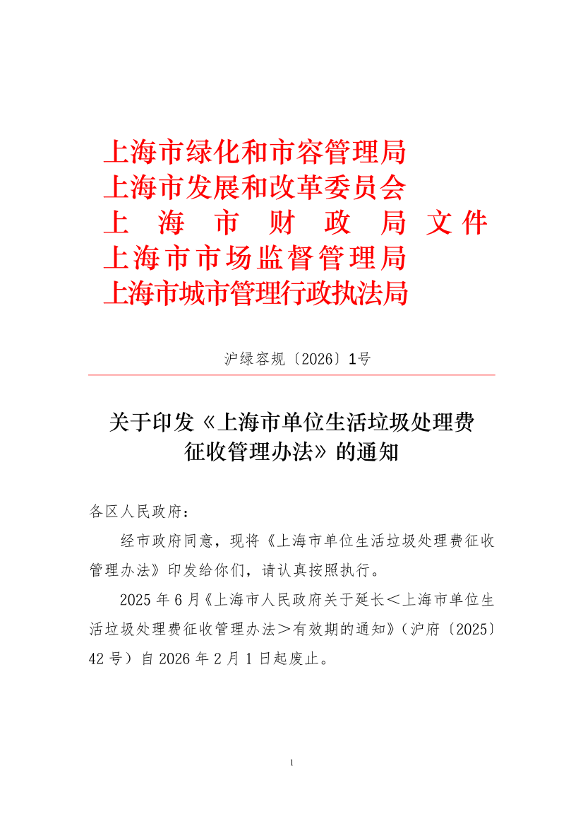 2025年6月《上海市人民政府关于延长<上海市单位生活垃圾处理费征收管理办法>有效期的通知》(沪府〔2025〕42号)自2026年2月1日起废止。