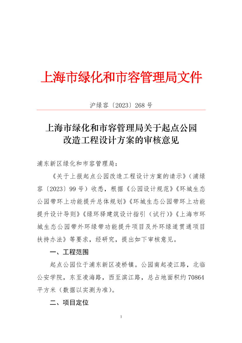 《关于上报起点公园改造工程设计方案的请示》(浦绿容〔2023〕99号)收悉,根据《公园设计规范》《环城生态公园带环上功能提升总体规划》《环城生态公园带环上功能提升设计导则》《绿环驿建筑设计指引(试行)》《上海市环城生态公园带外环绿带功能提升项目及外环绿道贯通项目扶持办法》等要求,经研究,提出如下审核意见。