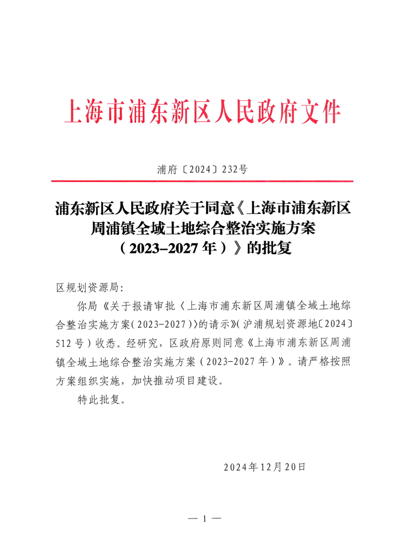 浦东新区人民政府关于同意《上海市浦东新区周浦镇全域土地综合整治实施方案(2023-2027年)》的批复