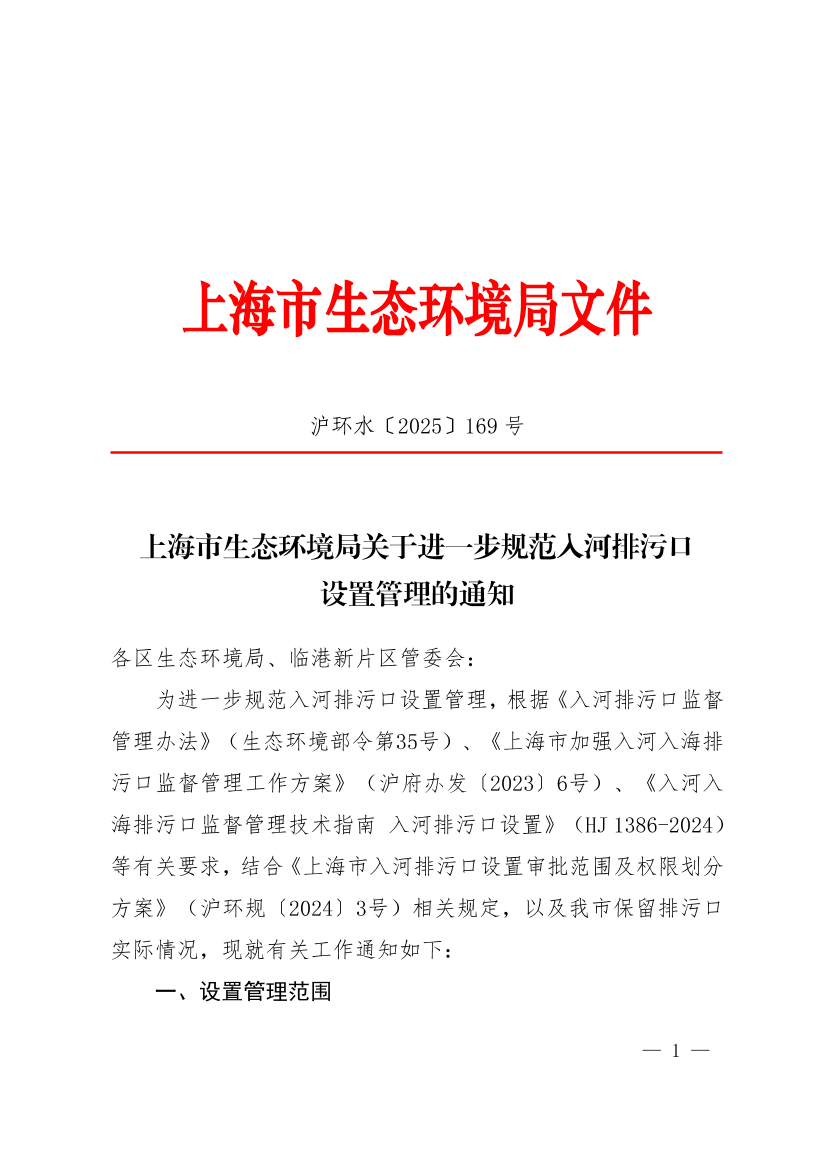 为进一步规范入河排污口设置管理,根据《入河排污口监督管理办法》(生态环境部令第35号)、《上海市加强入河入海排污口监督管理工作方案》(沪府办发〔2023〕6号)、《入河入海排污口监督管理技术指南 入河排污口设置》(HJ 1386-2024)等有关要求,结合《上海市入河排污口设置审批范围及权限划分方案》(沪环规〔2024〕3号)相关规定,以及我市保留排污口实际情况,现就有关工作通知如下: