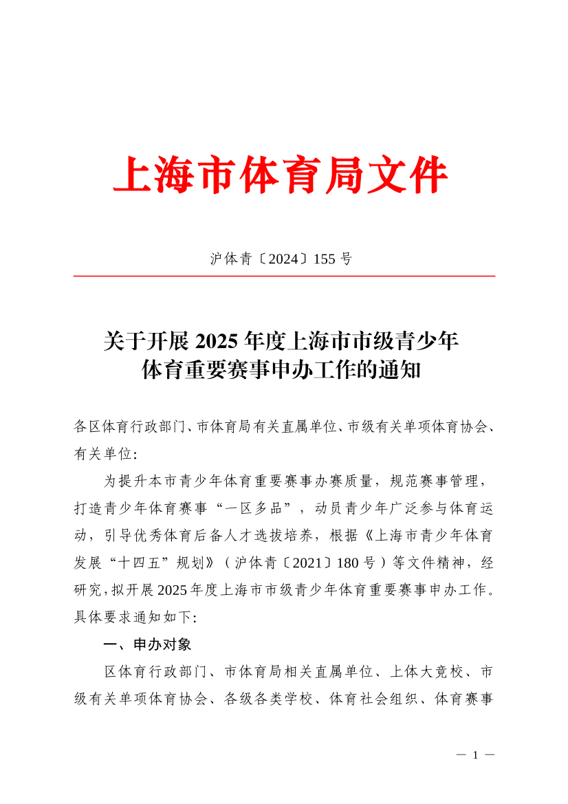 为提升本市青少年体育重要赛事办赛质量,规范赛事管理,打造青少年体育赛事“一区多品”,动员青少年广泛参与体育运动,引导优秀体育后备人才选拔培养,根据《上海市青少年体育发展“十四五”规划》(沪体青〔2021〕180号)等文件精神,经研究,拟开展2025年度上海市市级青少年体育重要赛事申办工作。具体要求通知如下: