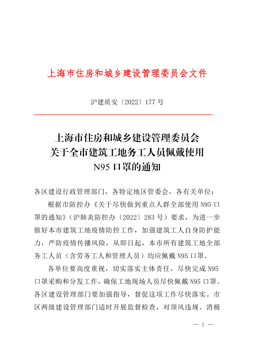 根据市防控办《关于尽快做到重点人群全部使用 N95 口 罩的通知》(沪肺炎防控办〔2022〕283 号)要求,为进一步 做好本市建筑工地疫情防控工作,加强建筑工人自身防护能 力,严防疫情传播风险,从即日起,本市所有建筑工地全部务工人员(含劳务工人和管理人员)均应佩戴 N95 口罩。 各单位要高度重视,切实落实主体责任,尽快完成 N95口罩采购和分发工作,确保工地现场人员尽快佩戴 N95 口罩。 各区建设管理部门要加强指导,督促这项工作尽快落实。市 区两级建设管理部门适时开展监督检查,对顶风违规、消极应对或拒不执行的要严肃查处。