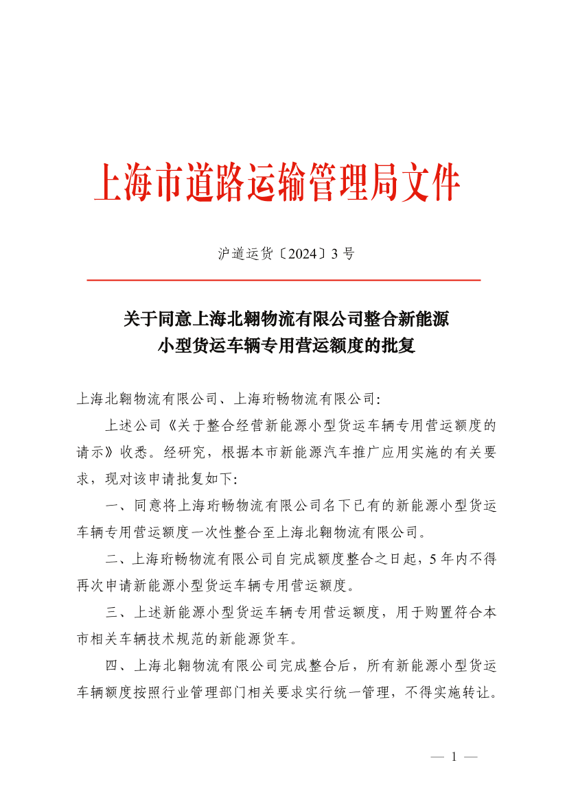 一、同意将上海珩畅物流有限公司名下已有的新能源小型货运车辆专用营运额度一次性整合至上海北翱物流有限公司。