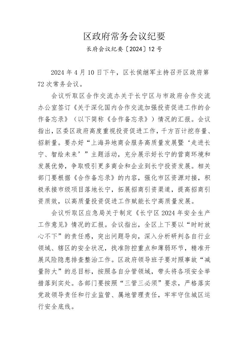 2024年4月10日下午,区长侯继军主持召开区政府第72次常务会议。