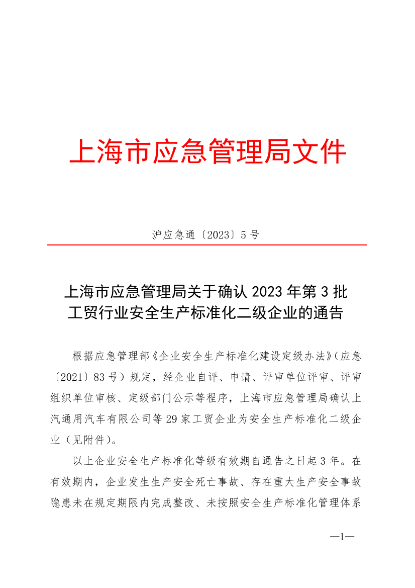 根据应急管理部《企业安全生产标准化建设定级办法》(应急〔2021〕83号)规定,经企业自评、申请、评审单位评审、评审组织单位审核、定级部门公示等程序,上海市应急管理局确认上汽通用汽车有限公司等29家工贸企业为安全生产标准化二级企业(见附件)。