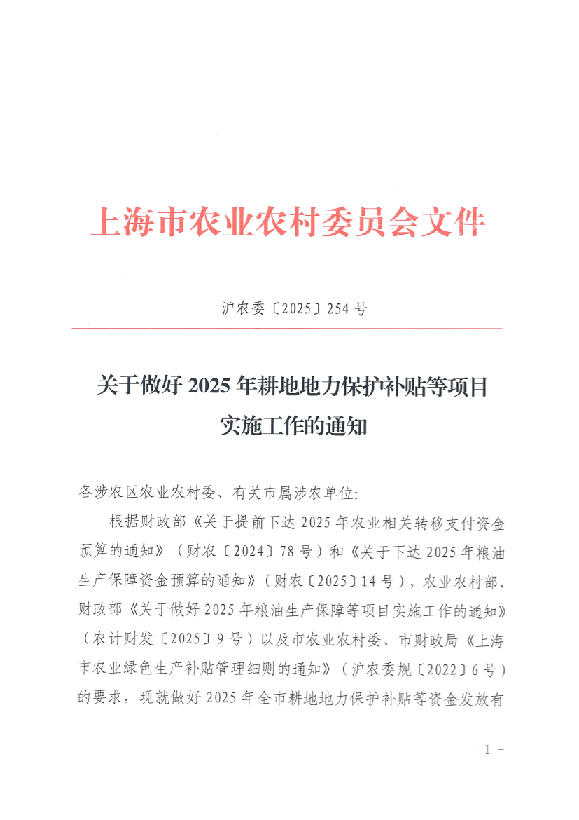 根据财政部《关于提前下达2025年农业相关转移支付资金预算的通知》(财农〔2024〕78号)和《关于下达2025年粮油生产保障资金预算的通知》(财农〔2025〕14号),农业农村部、财政部《关于做好2025年粮油生产保障等项目实施工作的通知》(农计财发〔2025〕9号)以及市农业农村委、市财政局《上海市农业绿色生产补贴管理细则的通知》(沪农委规〔2022〕6号)的要求,现就做好2025年全市耕地地力保护补贴等资金发放有关工作通知如下: