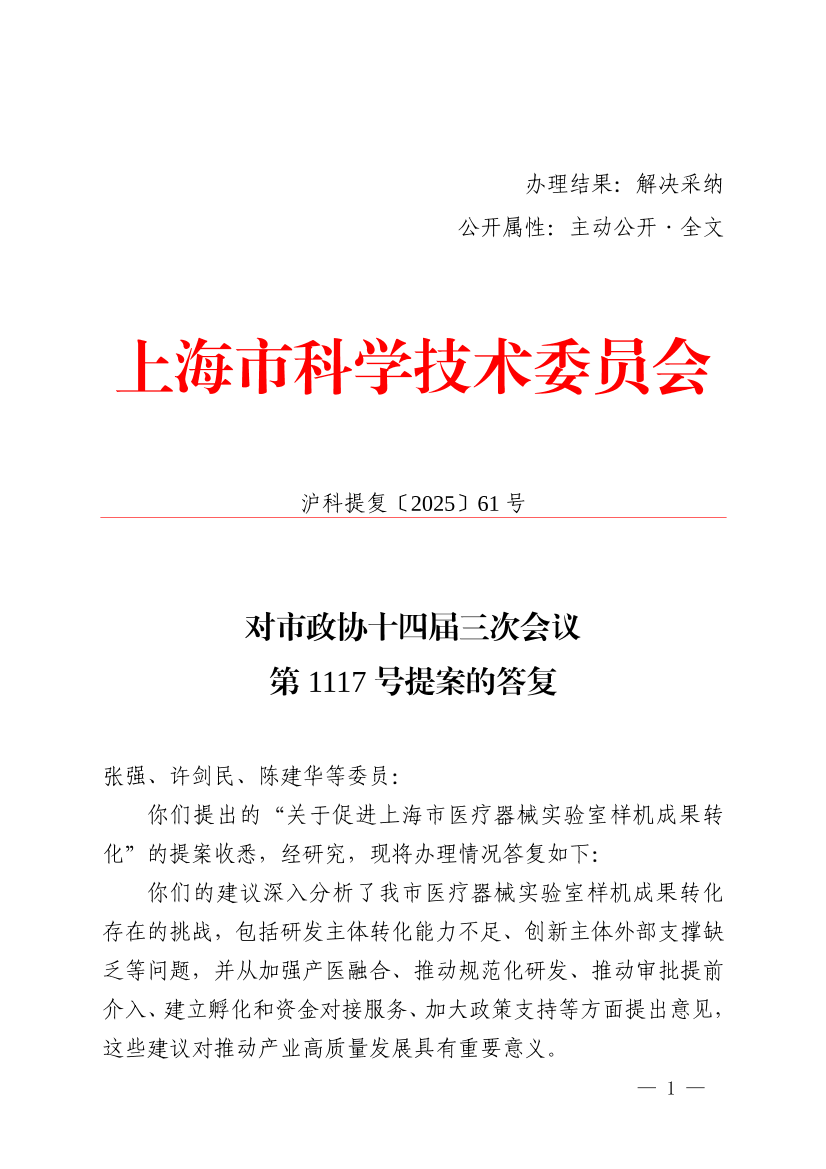 你们提出的“关于促进上海市医疗器械实验室样机成果转化”的提案收悉,经研究,现将办理情况答复如下: