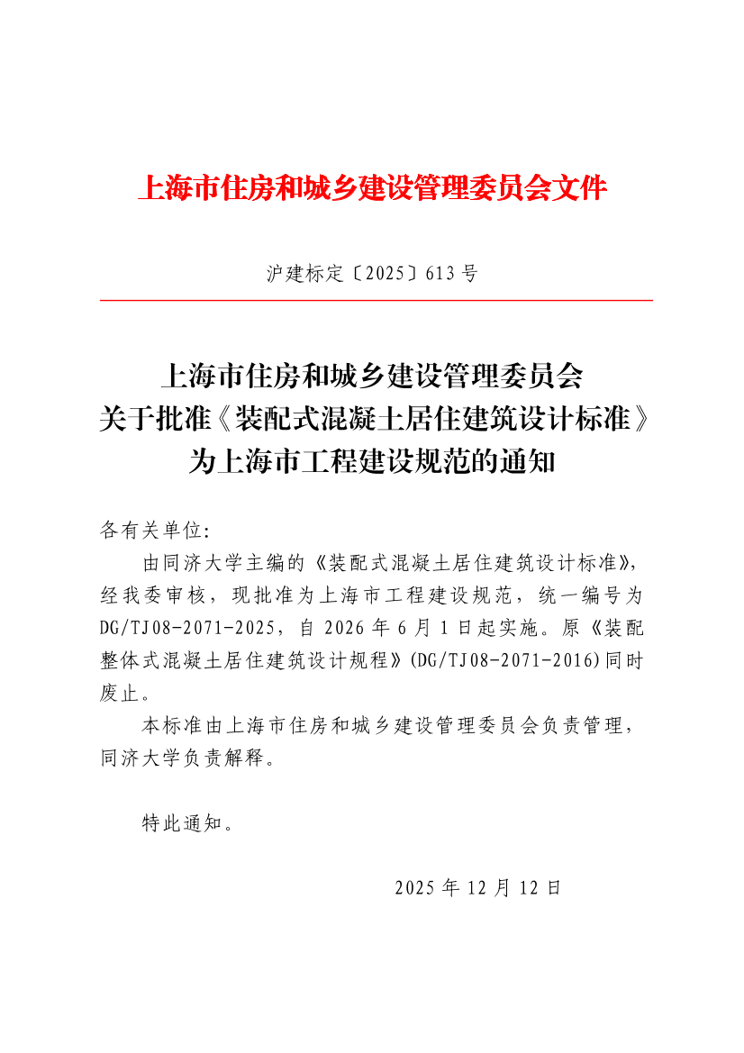 由同济大学主编的《装配式混凝土居住建筑设计标准》,经我委审核,现批准为上海市工程建设规范,统一编号为DG/TJ08-2071-2025,自2026年6月1日起实施。原《装配整体式混凝土居住建筑设计规程》(DG/TJ08-2071-2016)同时废止。